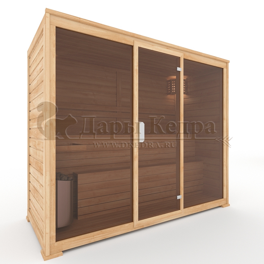 Это специально оборудованная готовая деревянная кабина для сухого и влажного парения. Электропечь нагревает пространство внутри и позволяет сбрызгивать камни водой, слегка увлажняя воздух. Такая процедура позволяет избежать перегрева. Сауна обшита снаружи и внутри кедровой вагонкой и имеет теплоизоляционный слой. Финская сауна с электропечью подойдет, как для домашнего использования, так и для коммерции. Доставляется в разборном виде щитами, собирается по инструкции с помощью шуруповёрта.
