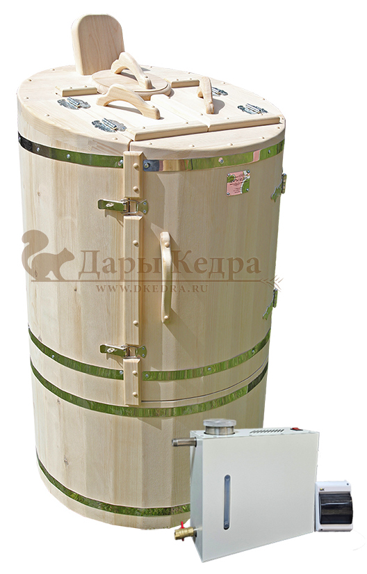 Готовый комплект «Доступный»: кедровая бочка с парогенератором Готовый комплект - это полностью укомплектованный набор с фитобочкой для процедур парения. Круглая модель наиболее компактна и мобильна. Толщина стенок составляет 25 мм. Фитобочка оборудована откидными створками, дверцей и отверстием для головы. Во время парения человек сидит внутри кедровой бочки, а голова находится снаружи. Благодаря этому исключается возможность перегрева. Подлокотники из кедра, встроенные ручки на створках и двери делают эксплуатацию более удобной. Парение в фитобочке благотворно влияет на организм в целом: повышается иммунитет, выводятся шлаки и токсины, улучшается работа органов тела и состояние кожи.