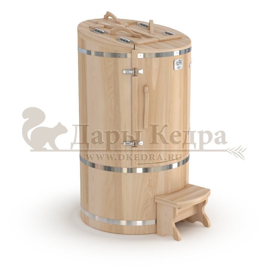 Готовый комплект «Удобный+»: кедровая бочка с парогенератором + био-защита изнутри и снаружи Готовый комплект - это полностью укомплектованный набор с фитобочкой для процедур парения. Овальная модель более просторна и удобна в использовании. Толщина стенок составляет 25 мм. Бочка оборудована откидными створками, дверцей и отверстием для головы. Верхний скос изделия делает положение головы более комфортным и улучшает обзор. Во время парения человек сидит внутри кедровой бочки, а голова находится снаружи. Благодаря этому исключается возможность перегрева. Подлокотники из кедра, встроенные ручки на створках и двери делают эксплуатацию более удобной. Парение в фитобочке благотворно влияет на организм в целом: повышается иммунитет, выводятся шлаки и токсины, улучшается работа органов тела и состояние кожи.