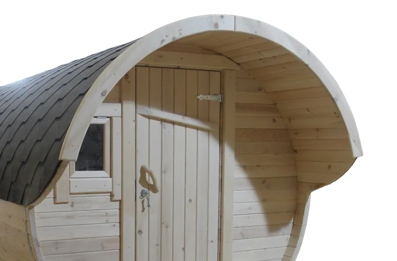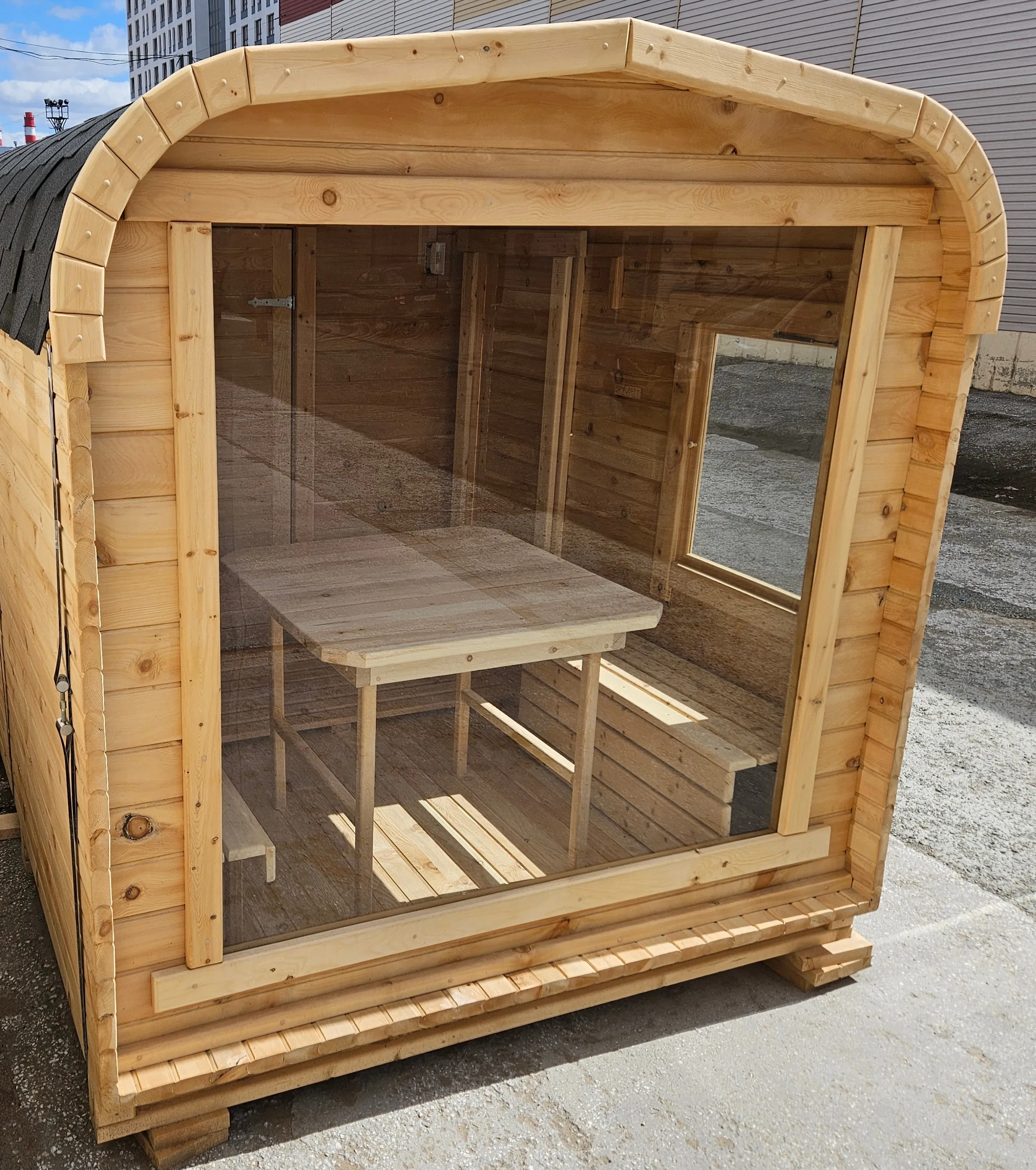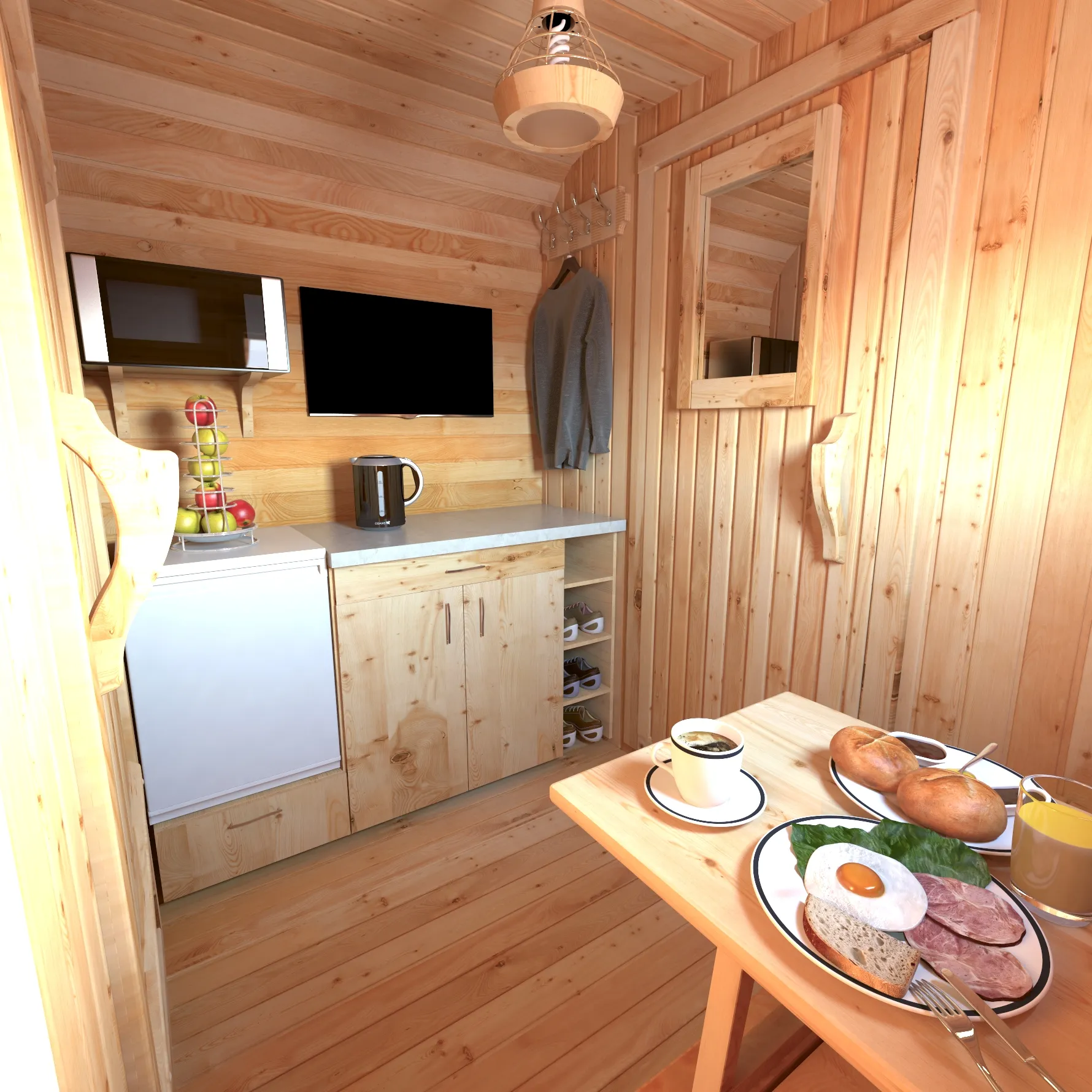 Компактный однокомнатный домик подойдет для дачного использования в теплое время года или обустройства загородных баз отдыха. Домик оборудован двумя лежаками из кедра, между которыми пользования можно поставить откидной столик. Для удобства пользования кемпинг дом можно укомплектовать верандой с лавочками или козырьком.