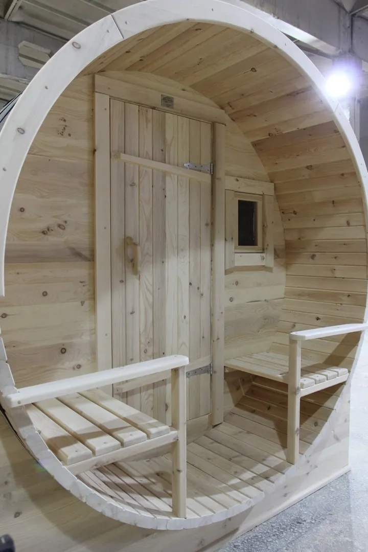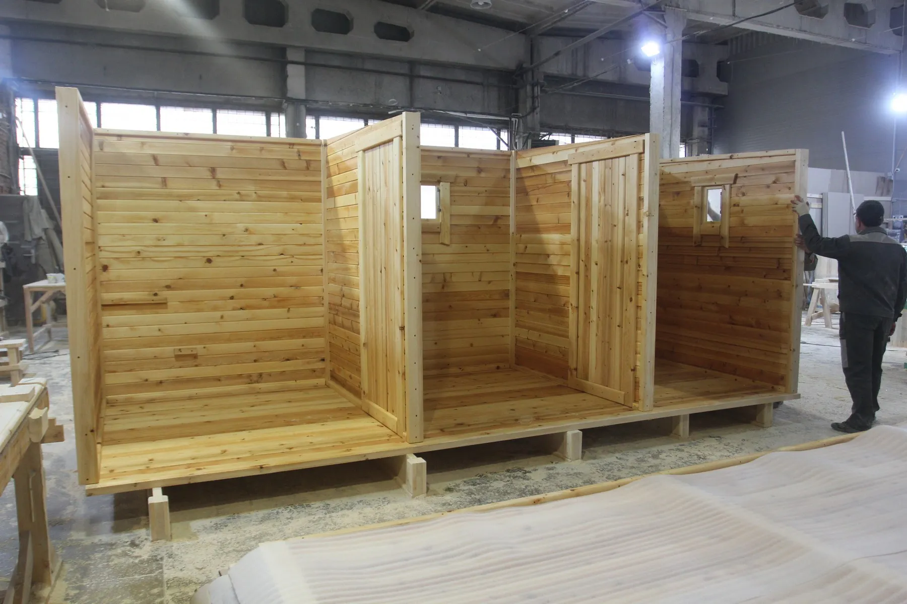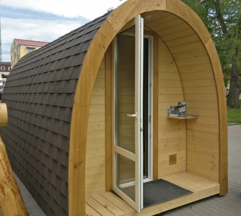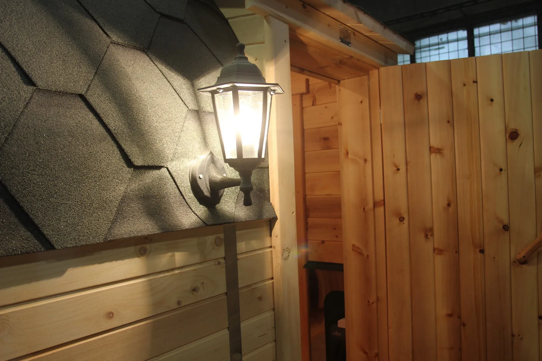 Компактный однокомнатный домик подойдет для дачного использования в теплое время года или обустройства загородных баз отдыха. Домик оборудован двумя лежаками из кедра, между которыми пользования можно поставить откидной столик. Для удобства пользования кемпинг дом можно укомплектовать верандой с лавочками или козырьком.