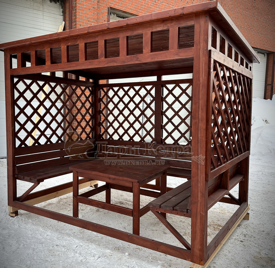 Беседка из металла Беседка выполнена из стальной квадратной профильной трубы 40х40 мм. Лавки и стол обшиты кедровой доской. На крыше - ондулин. Беседка отличается простотой в установке, легкостью конструкции, долговечностью, прочностью и классическим дизайном, который впишется в любой интерьер приусадебного участка. Вокруг такой беседки можно организовать ландшафт из вьющихся растений, которые красиво создадут зеленые 'стены' снаружи и уют внутри. Размер стола у разных моделей варьируется в зависимости от ширины конструкции.